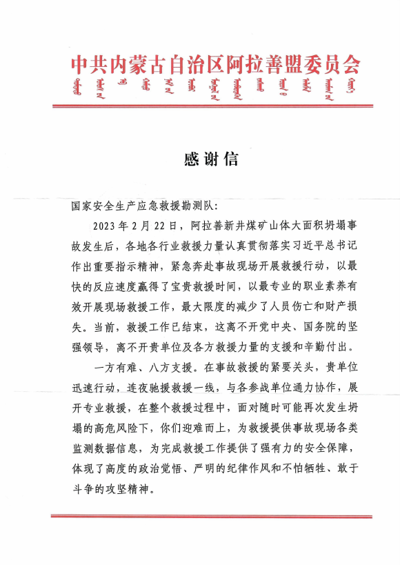 2023年5月15日,中共内蒙古自治区阿拉善盟委员会向我公司发来感谢信,对国家安全生产应急救援勘测队(由我公司边坡雷达创新团队人员组成)在阿拉善新井煤矿坍塌事故救援行动中提供的安全保障技术支撑、高效务实的工作作风和顽强奋斗的拼搏精神,给予崇高敬意和由衷感谢!